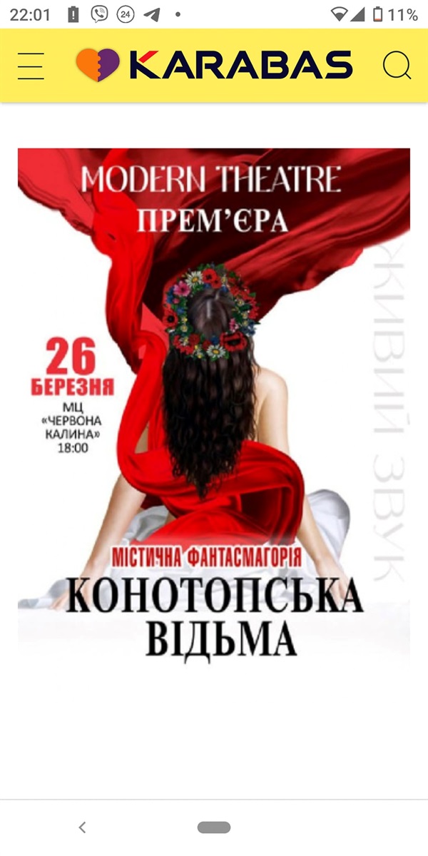 26 березня о 18:00 в приміщенні МЦ “Червона Калина” сучасний театр антерпризи “Модерн” з Полтави познайомить долинчан зі своєю прем’єрою - виставою “Конотопські відьми”. Квитки вже в продажу - поспішайте придбати.