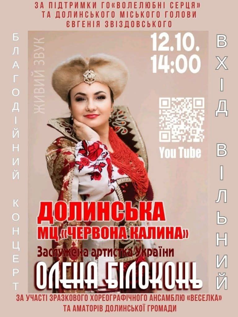 На запрошення Громадської організації “Волелюбні серця” та за підтримки голови Долинської територіальної громади Євгенія Звіздовського з благодійним концертом відвідає Долинську Заслужена артистка України Олена Білоконь.