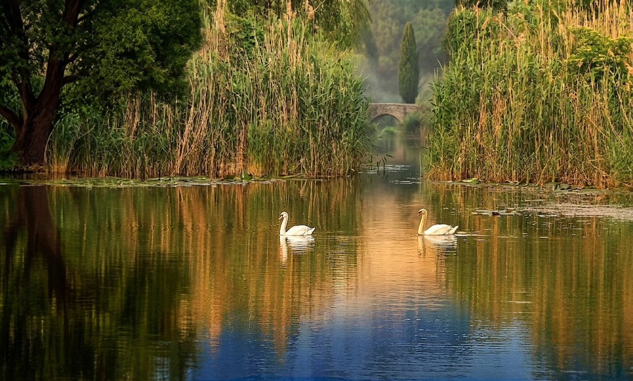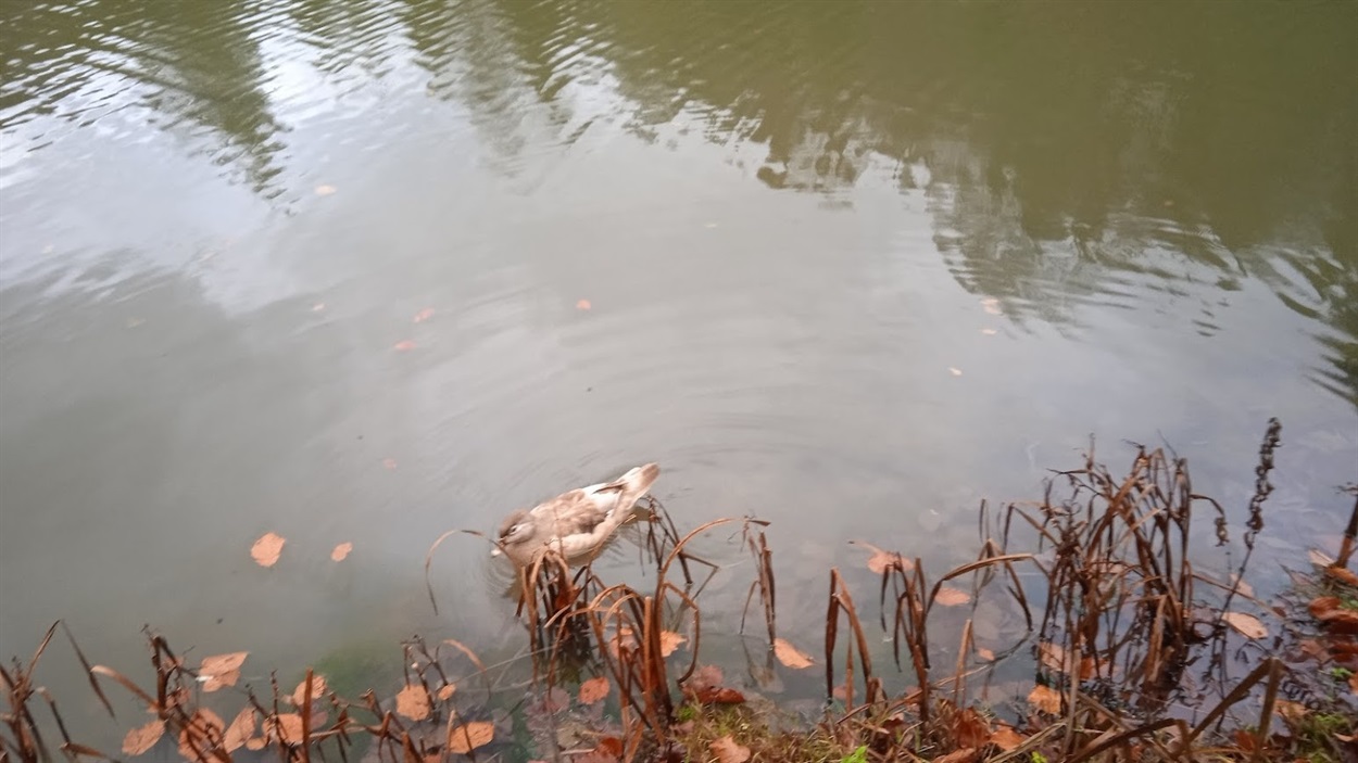 Повз будиночок пропливають качечки, кумедно кивають голівками, ніби вітаються з кимось. Напевно з тією ж таки дівчиною. Хлопчик зупиняється, проводжає качечок поглядом. Іноді він крише їм хліб, а вони ловлять його у воді потішно ковтають, крячуть у відповідь і пливуть собі далі.